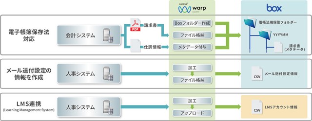 ●Boxに月単位でフォルダーを自動作成し、メタ情報を付与した請求書を格納する処理を実装。短期間かつ低コストで電帳法への対応を実現 ●RPAで行っている入力作業をASTERIA Warp Coreで自動化し、パフォーマンスが安定